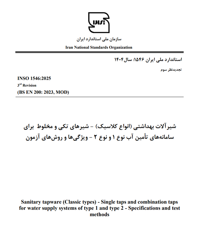 متن استاندارد ملی شمارهی 1546 با عنوان "شیرآلات بهداشتی (انواع کلاسیک) - شیرهای تکی و مخلوط برای سامانه های تأمین آب نوع 1 و نوع 2 - ویژگی ها و روش های آزمون"